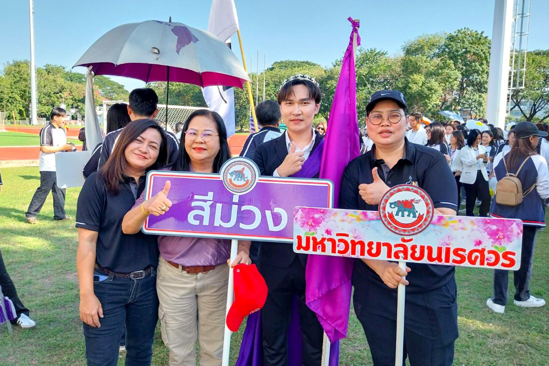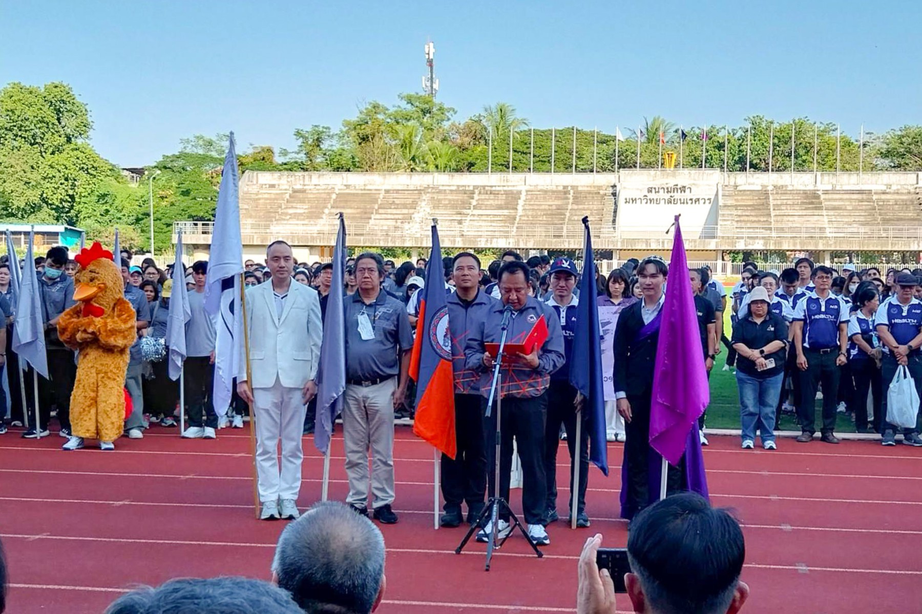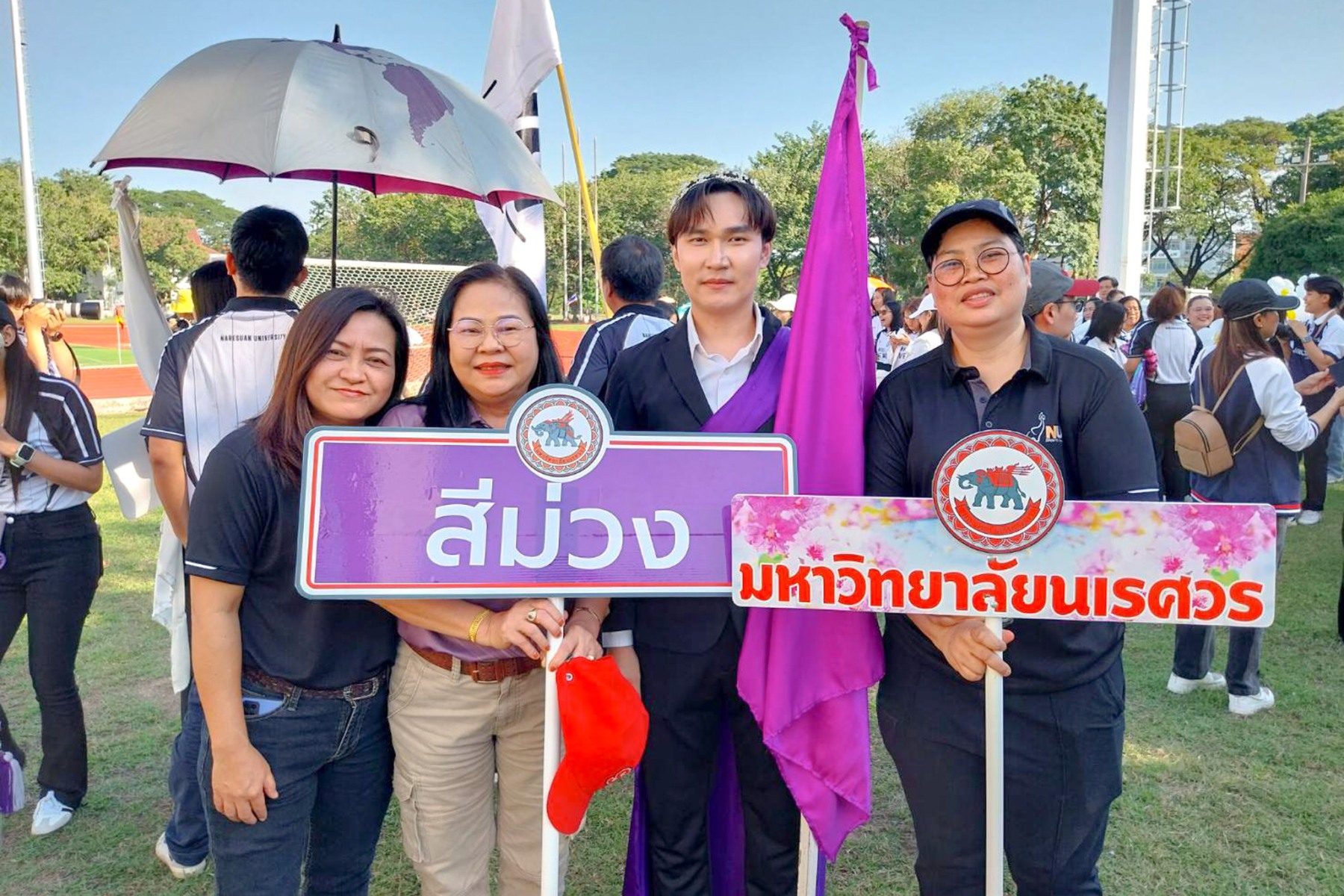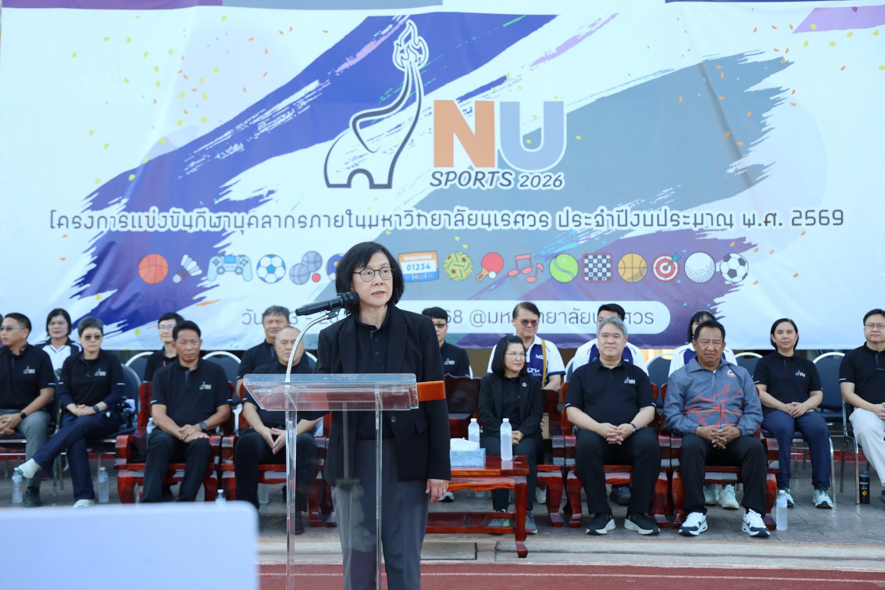 วันที่ 22 ธันวาคม 2568 นางจิระประภา ศรีปัตตา ผู้อำนวยการกองพัฒนาคุณภาพการศึกษา พร้อมด้วยบุคลากร เข้าร่วมพิธีเปิดการแข่งขันกีฬาบุคลากรภายในมหาวิทยาลัยนเรศวร ประจำปี 2569 (NU Sports 2026) โดยมี รองศาสตราจารย์ ดร.ศรินทร์ทิพย์ แทนธานี รักษาราชการแทนอธิการบดีมหาวิทยาลัยนเรศวร เป็นประธานในพิธี ร่วมกับคณะผู้บริหารมหาวิทยาลัย บรรยากาศงานเต็มไปด้วยความสนุกสนานและความสามัคคี โดยเริ่มต้นด้วยขบวนพาเหรดจากหน่วยงานต่าง ๆ ซึ่งแต่งกายตามสีประจำทีม โดยกองพัฒนาคุณภาพการศึกษามีบุคลากรเป็นตัวแทนถือธงนำขบวนพาเหรดสีม่วง ช่วยเสริมบรรยากาศให้คึกคักยิ่งขึ้น ก่อนเข้าสู่กิจกรรมเต้นแอโรบิกเพื่อส่งเสริมสุขภาพและสร้างความร่วมมือ พร้อมเสียงเชียร์จากทั้งสี่สี ได้แก่ สีม่วง สีขาว สีกรม และสีเทา ที่ช่วยเพิ่มสีสันให้กับงาน กิจกรรมครั้งนี้ไม่เพียงส่งเสริมสุขภาพกายใจเท่านั้น แต่ยังช่วยกระชับความสัมพันธ์ระหว่างบุคลากรในมหาวิทยาลัยให้แน่นแฟ้นยิ่งขึ้น โดยกิจกรรมจัดขึ้น ณ สนามฟุตบอล 1 มหาวิทยาลัยนเรศวร
