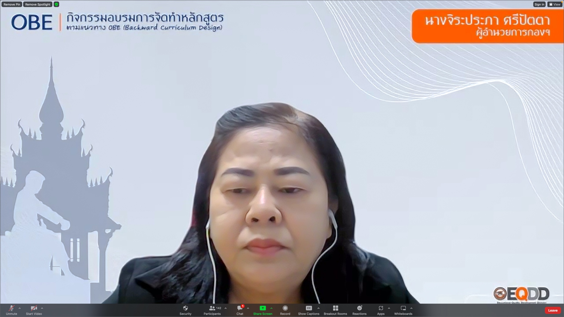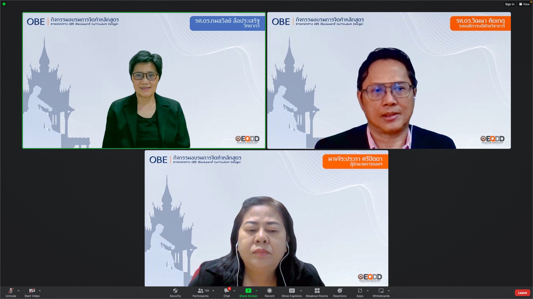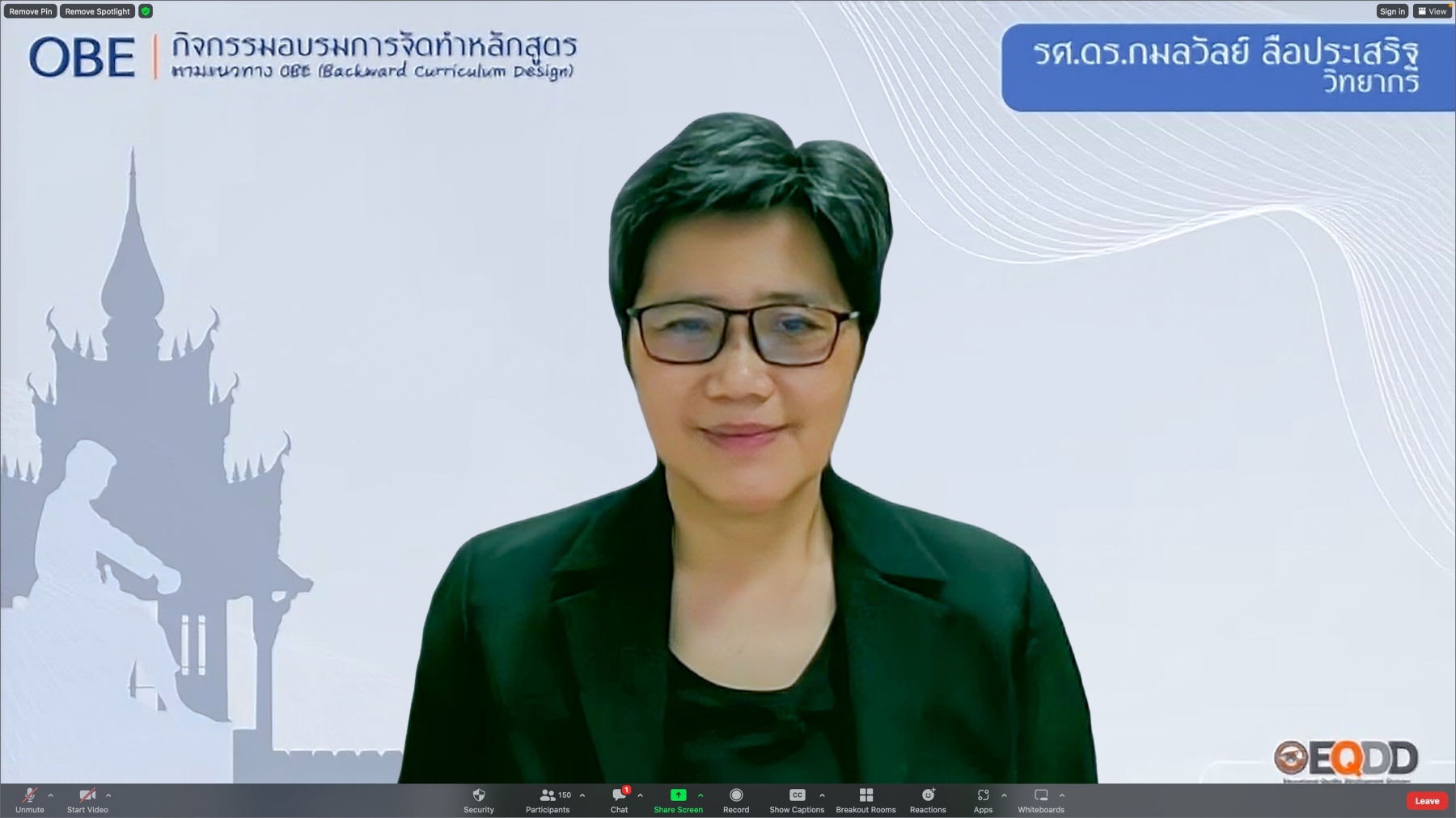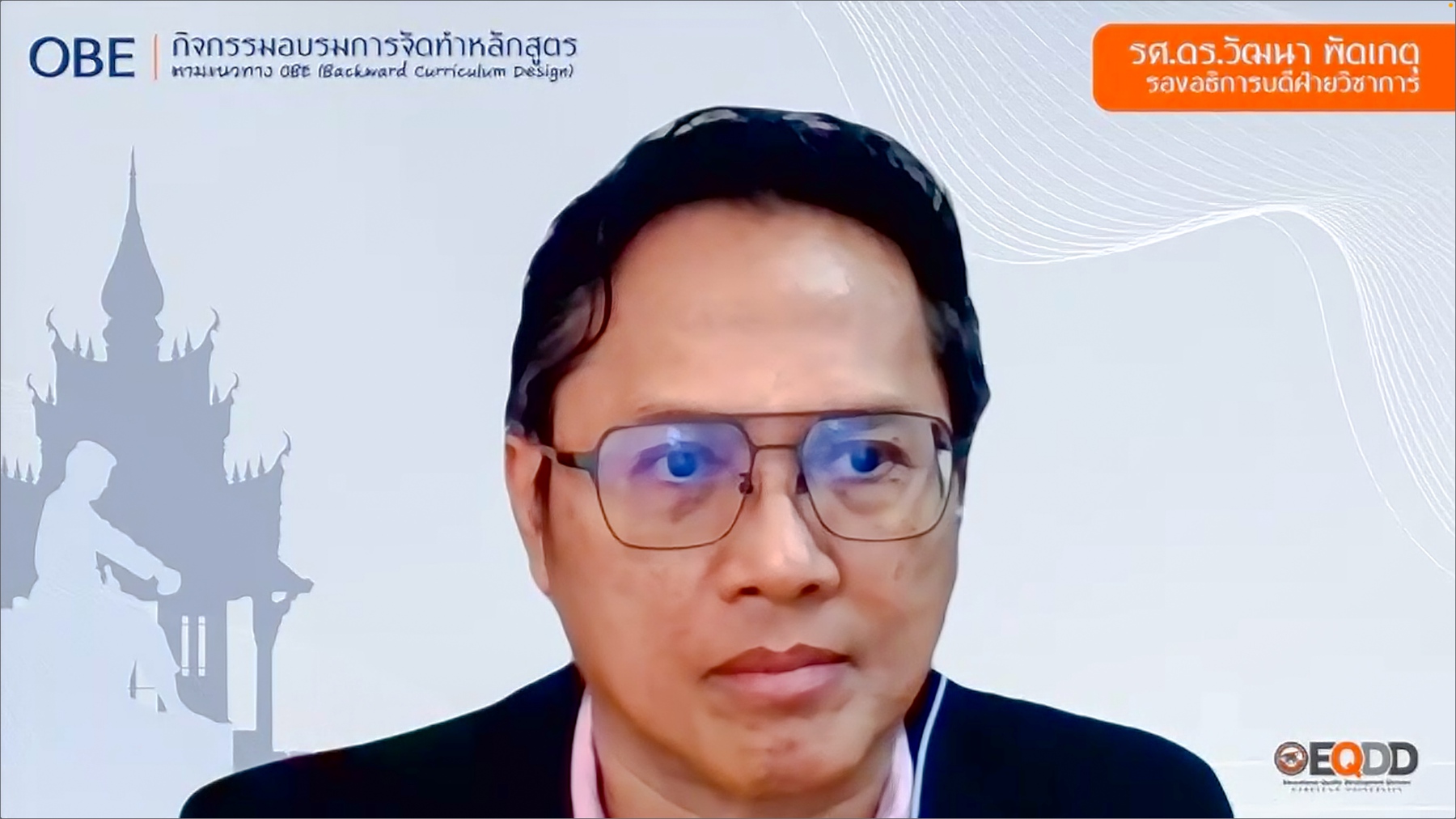 วันที่ 26 มีนาคม 2567 รองศาสตราจารย์ ดร.วัฒนา พัดเกตุ รองอธิการบดีฝ่ายวิชาการ เป็นประธาน พร้อมด้วย รองศาสตราจารย์ ดร.อรรถกร ทองทา ผู้ช่วยอธิการบดีฝ่ายวิชาการ และ นางจิระประภา ศรีปัตตา ผู้อำนวยการกองพัฒนาคุณภาพการศึกษา ร่วมกิจกรรมอบรมการจัดทำหลักสูตรตามแนวทาง OBE (Backward Curriculum Design) โดยมุ่งเน้นผลลัพธ์การเรียนรู้ที่คาดหวังของผู้เรียนเป็นสำคัญ เพื่อให้ผู้เรียนบรรลุเป้าหมายการเรียนรู้ ให้เป็นไปตามหลักแนวคิดของเกณฑ์ AUN-QA รวมถึงการพัฒนาหรือปรับปรุงหลักสูตรตามเกณฑ์มาตรฐานหลักสูตร พ.ศ. 2565 ที่มุ่งเน้น OBE ซึ่งได้รับเกียรติจาก รองศาสตราจารย์ ดร.กมลวัลย์ ลือประเสริฐ สังกัด มหาวิทยาลัยเทคโนโลยีพระจอมเกล้าพระนครเหนือ เป็นวิทยากรให้ความรู้ โดยจัดกิจกรรมในรูปแบบออนไลน์ผ่านทางระบบ Zoom Cloud Meetings