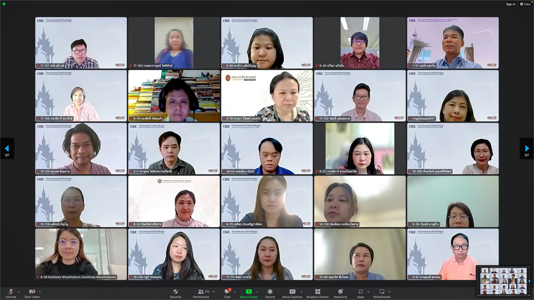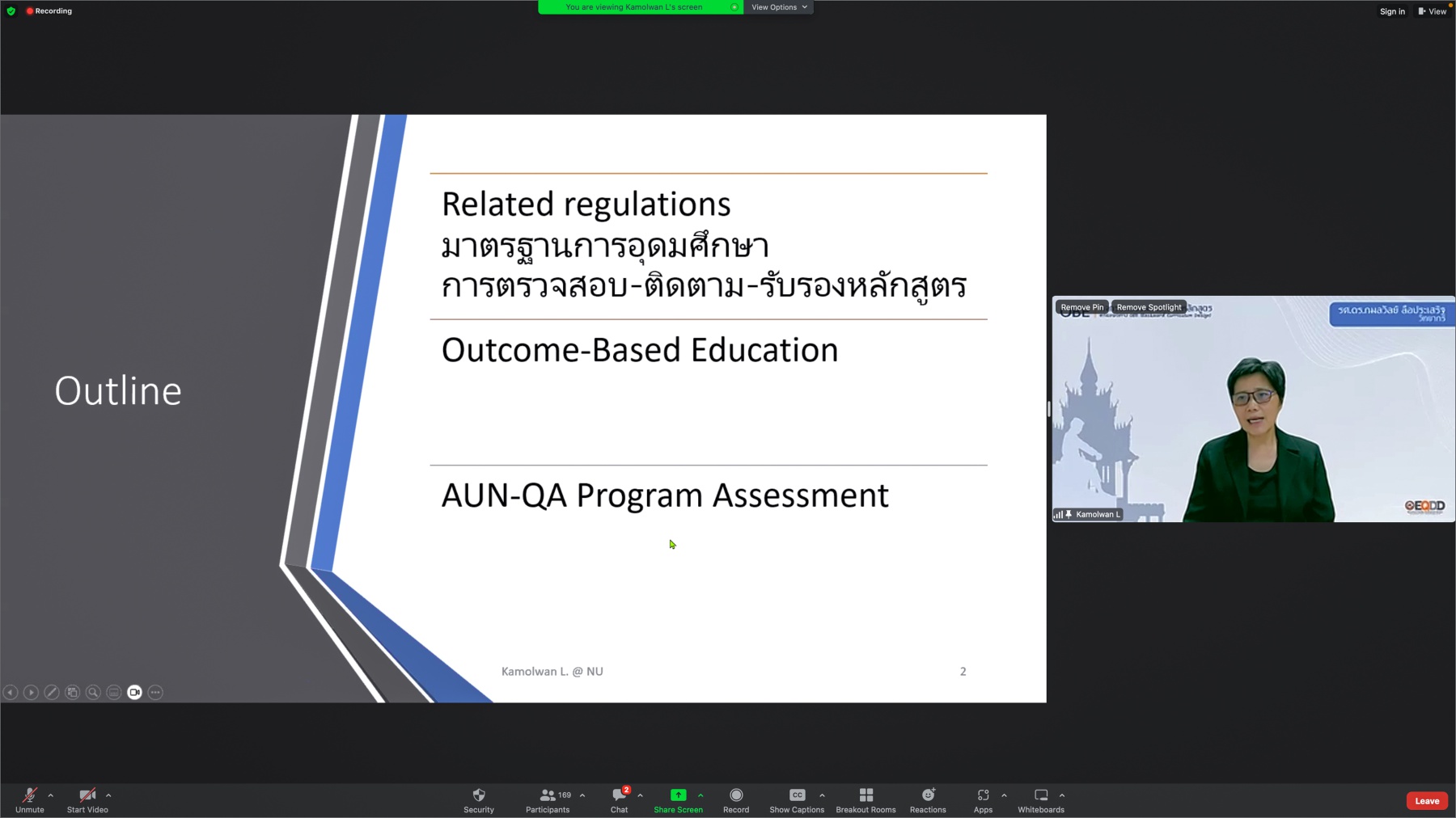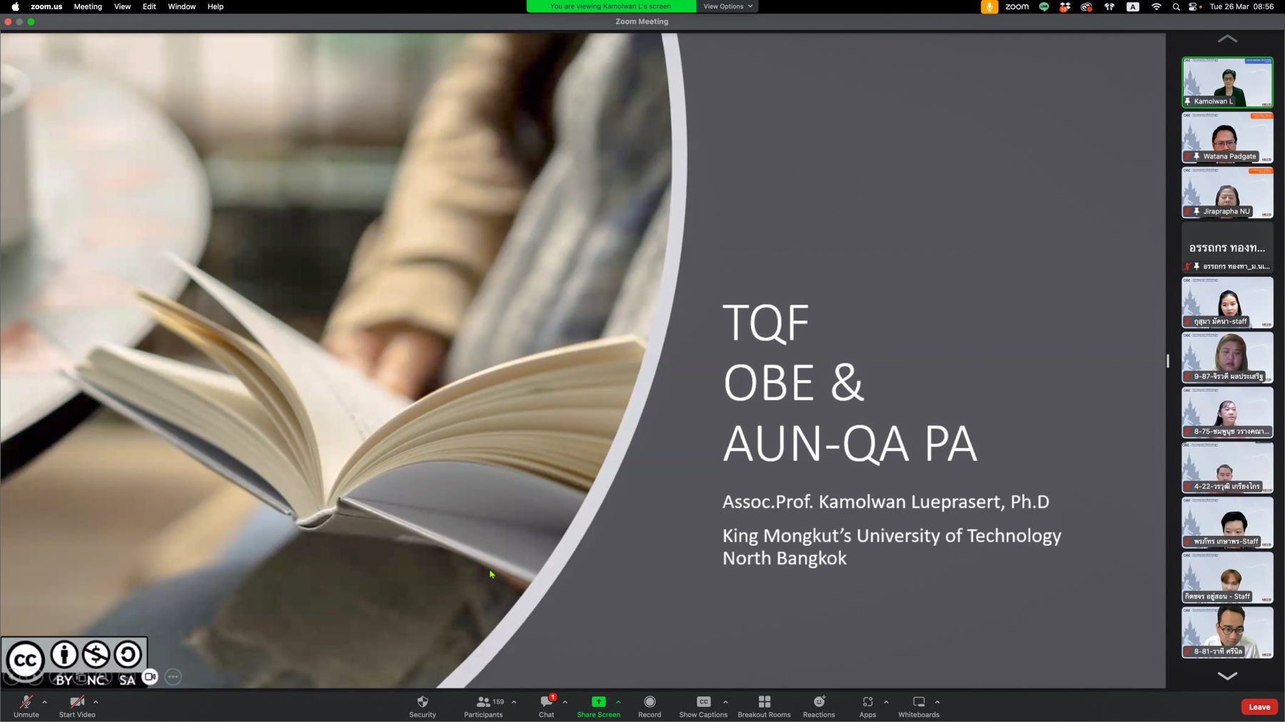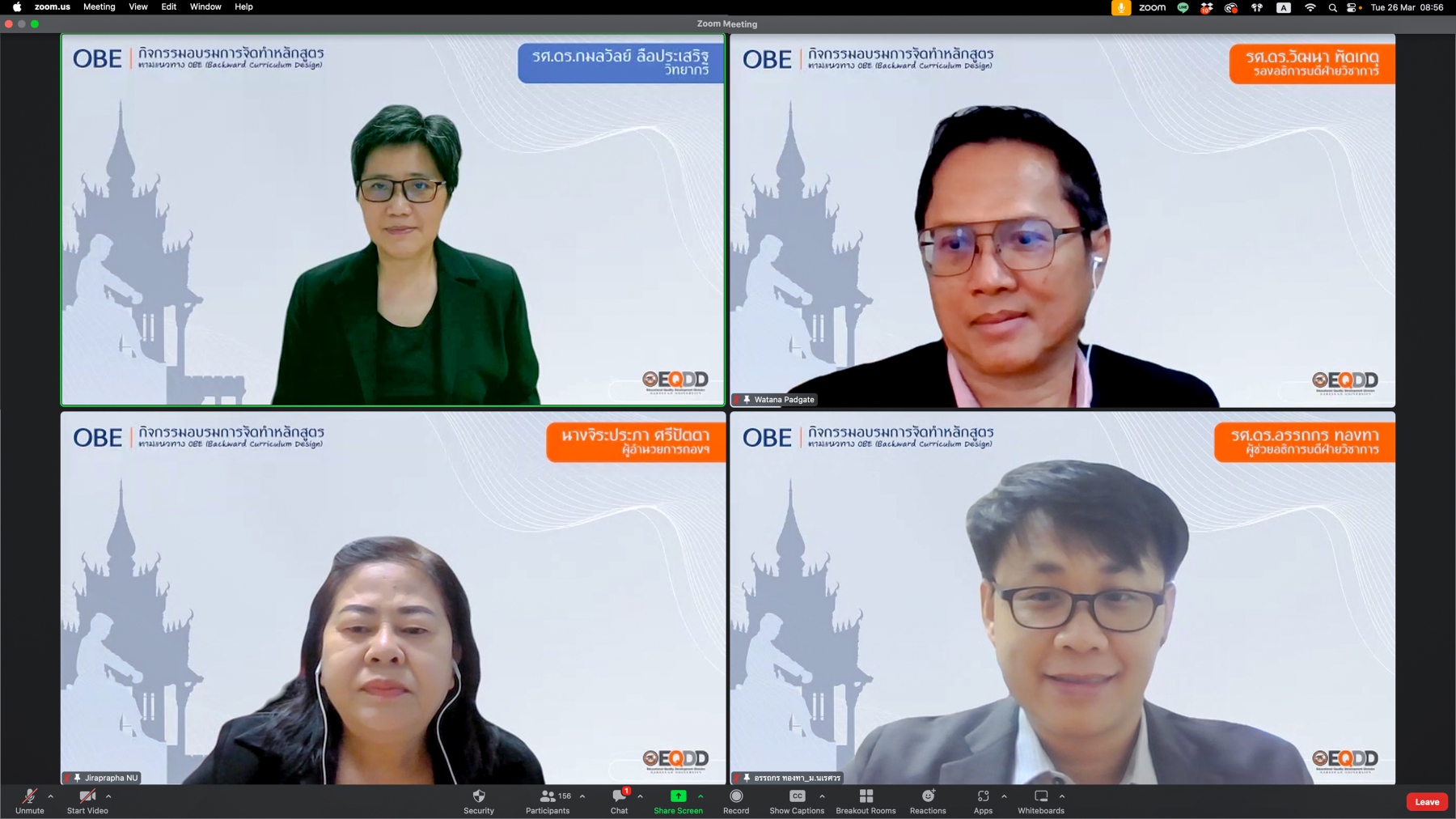 วันที่ 26 มีนาคม 2567 รองศาสตราจารย์ ดร.วัฒนา พัดเกตุ รองอธิการบดีฝ่ายวิชาการ เป็นประธาน พร้อมด้วย รองศาสตราจารย์ ดร.อรรถกร ทองทา ผู้ช่วยอธิการบดีฝ่ายวิชาการ และ นางจิระประภา ศรีปัตตา ผู้อำนวยการกองพัฒนาคุณภาพการศึกษา ร่วมกิจกรรมอบรมการจัดทำหลักสูตรตามแนวทาง OBE (Backward Curriculum Design) โดยมุ่งเน้นผลลัพธ์การเรียนรู้ที่คาดหวังของผู้เรียนเป็นสำคัญ เพื่อให้ผู้เรียนบรรลุเป้าหมายการเรียนรู้ ให้เป็นไปตามหลักแนวคิดของเกณฑ์ AUN-QA รวมถึงการพัฒนาหรือปรับปรุงหลักสูตรตามเกณฑ์มาตรฐานหลักสูตร พ.ศ. 2565 ที่มุ่งเน้น OBE ซึ่งได้รับเกียรติจาก รองศาสตราจารย์ ดร.กมลวัลย์ ลือประเสริฐ สังกัด มหาวิทยาลัยเทคโนโลยีพระจอมเกล้าพระนครเหนือ เป็นวิทยากรให้ความรู้ โดยจัดกิจกรรมในรูปแบบออนไลน์ผ่านทางระบบ Zoom Cloud Meetings