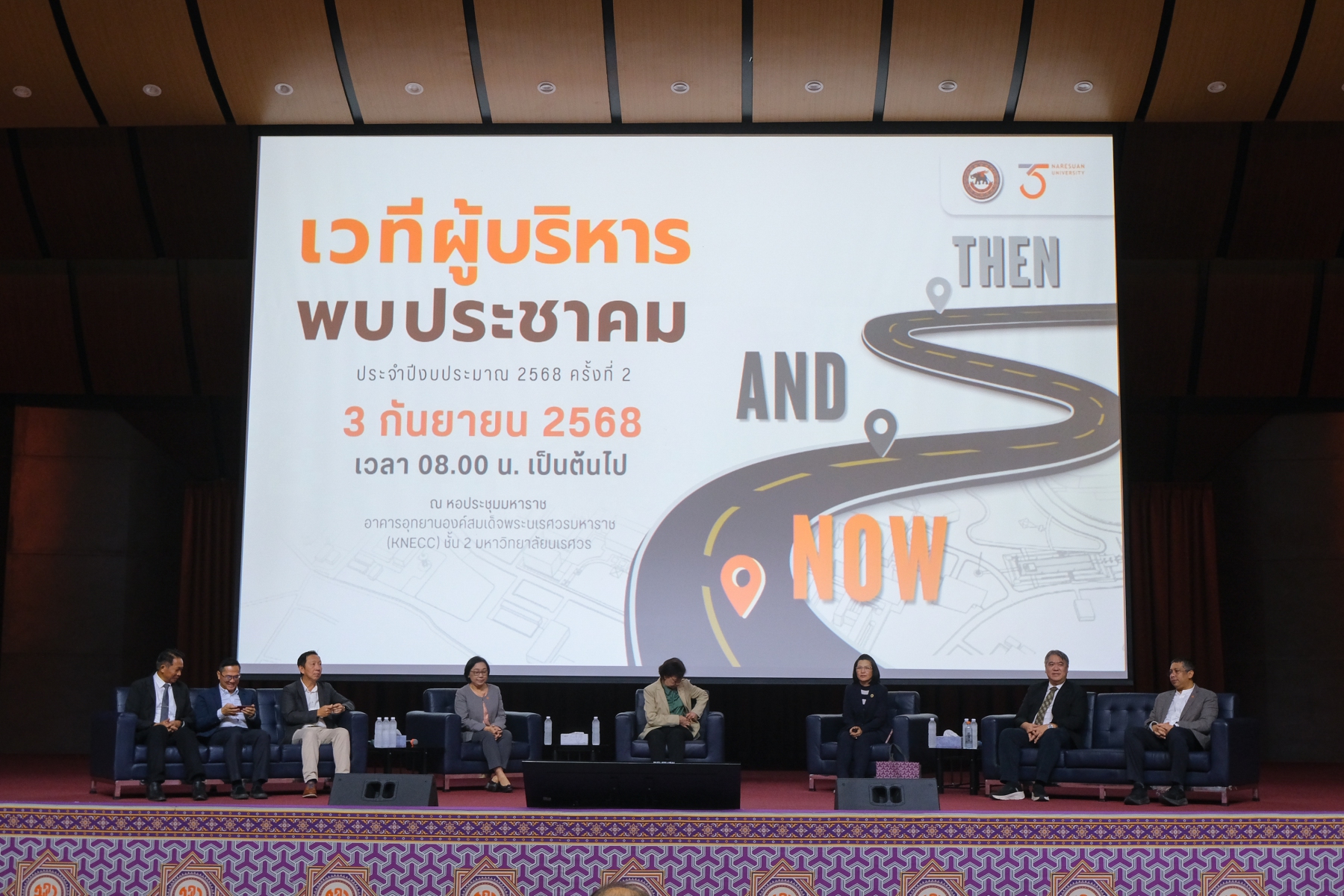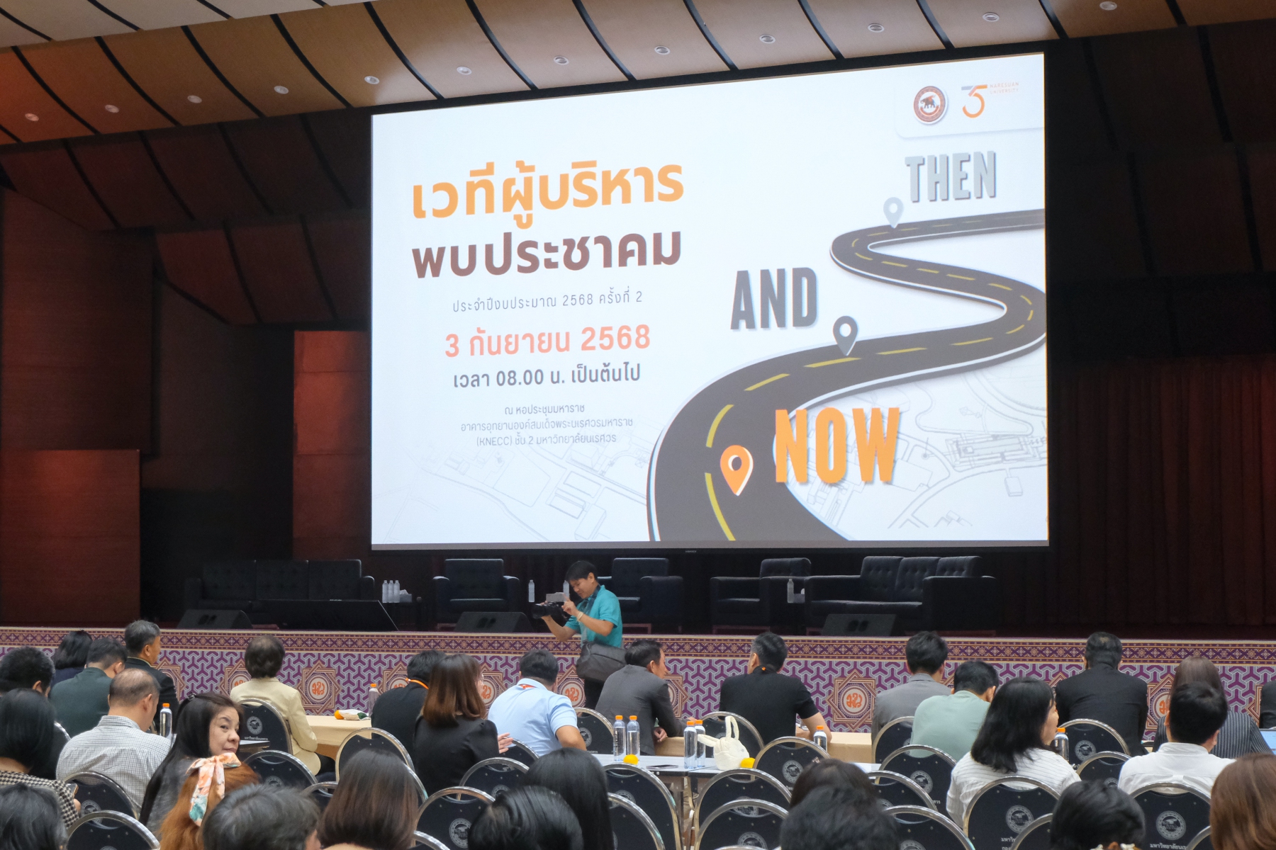 วันที่ 3 กันยายน 2568 นางจิระประภา ศรีปัตตา ผู้อำนวยการกองพัฒนาคุณภาพการศึกษา ได้นำบุคลากรเข้าร่วมเวทีผู้บริหารพบประชาคมมหาวิทยาลัยนเรศวร ประจำปีงบประมาณ 2568 (ครั้งที่ 2) “Then and Now” เพื่อรับฟังการนำเสนอผลการดำเนินงานที่ผ่านมาและทิศทางของมหาวิทยาลัยในอนาคต โดยรองศาสตราจารย์ ดร.ศรินทิพย์ แทนธานี รักษาราชการแทนอธิการบดีมหาวิทยาลัยนเรศวร พร้อมทีมผู้บริหาร พร้อมทั้งเปิดโอกาสให้คณาจารย์ บุคลากร และนิสิตได้ซักถามและแลกเปลี่ยนข้อคิดเห็นโดยตรงกับผู้บริหาร กิจกรรมดังกล่าวมุ่งสร้างการมีส่วนร่วมในการกำหนดแนวทางการพัฒนามหาวิทยาลัย โดยมีผู้เข้าร่วมทั้งในรูปแบบออนไลน์และออนไซต์กว่า 1,000 คน ณ หอประชุมมหาราช อาคารอุทยานองค์สมเด็จพระนเรศวรมหาราช ชั้น 2 มหาวิทยาลัยนเรศวร