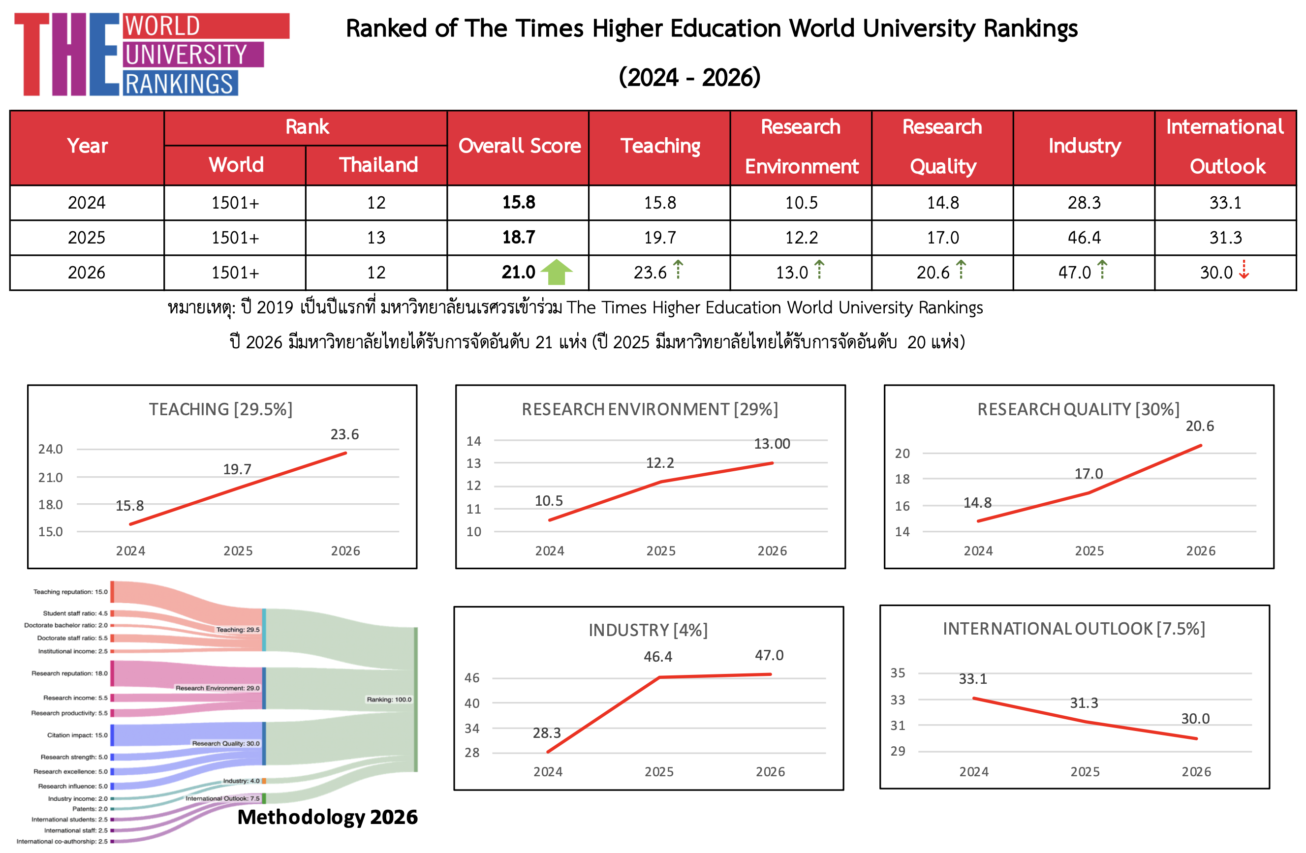 >> อันดับในประเทศไทย ได้รับการการจัดอันดับที่ 12 ร่วมกับ 9 มหาวิทยาลัย หรืออยู่ในกลุ่มอับดับ 6 ของประเทศไทย โดยมี 21 มหาวิทยาลัยไทยที่ได้รับการจัดอันดับ (ปี 2025 ได้อันดับที่ 13 ร่วมกับ 7 มหาวิทยาลัย โดยมี 20 มหาวิทยาลัยไทยที่ได้รับการจัดอันดับ)