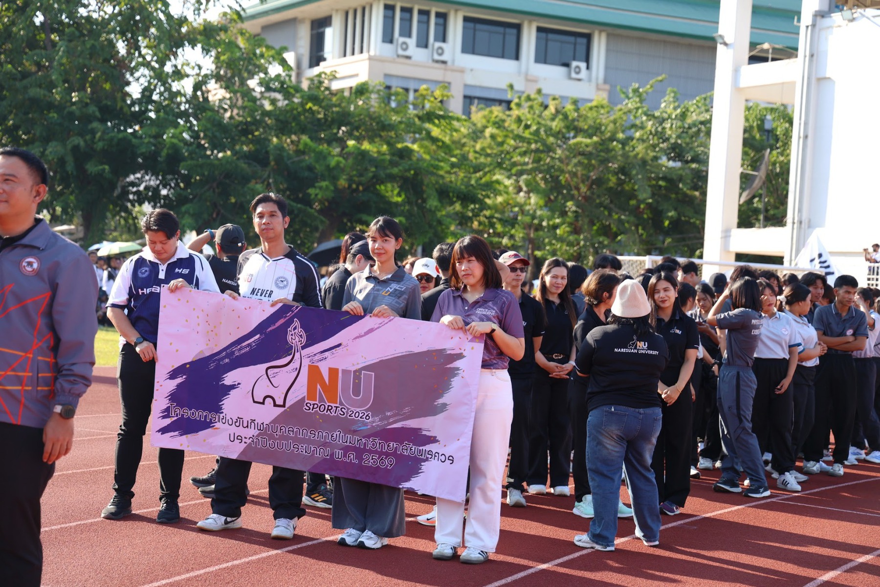 วันที่ 22 ธันวาคม 2568 นางจิระประภา ศรีปัตตา ผู้อำนวยการกองพัฒนาคุณภาพการศึกษา พร้อมด้วยบุคลากร เข้าร่วมพิธีเปิดการแข่งขันกีฬาบุคลากรภายในมหาวิทยาลัยนเรศวร ประจำปี 2569 (NU Sports 2026) โดยมี รองศาสตราจารย์ ดร.ศรินทร์ทิพย์ แทนธานี รักษาราชการแทนอธิการบดีมหาวิทยาลัยนเรศวร เป็นประธานในพิธี ร่วมกับคณะผู้บริหารมหาวิทยาลัย บรรยากาศงานเต็มไปด้วยความสนุกสนานและความสามัคคี โดยเริ่มต้นด้วยขบวนพาเหรดจากหน่วยงานต่าง ๆ ซึ่งแต่งกายตามสีประจำทีม โดยกองพัฒนาคุณภาพการศึกษามีบุคลากรเป็นตัวแทนถือธงนำขบวนพาเหรดสีม่วง ช่วยเสริมบรรยากาศให้คึกคักยิ่งขึ้น ก่อนเข้าสู่กิจกรรมเต้นแอโรบิกเพื่อส่งเสริมสุขภาพและสร้างความร่วมมือ พร้อมเสียงเชียร์จากทั้งสี่สี ได้แก่ สีม่วง สีขาว สีกรม และสีเทา ที่ช่วยเพิ่มสีสันให้กับงาน กิจกรรมครั้งนี้ไม่เพียงส่งเสริมสุขภาพกายใจเท่านั้น แต่ยังช่วยกระชับความสัมพันธ์ระหว่างบุคลากรในมหาวิทยาลัยให้แน่นแฟ้นยิ่งขึ้น โดยกิจกรรมจัดขึ้น ณ สนามฟุตบอล 1 มหาวิทยาลัยนเรศวร